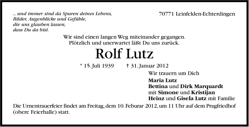 Hier finden Sie alle Traueranzeigen aus der Zeitung, die bisher für Rolf Lutz erschienen sind. Weitere Traueranzeigen, die in der Zeitung erscheinen, werden hier ebenfalls aufgelistet