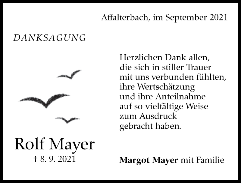Hier finden Sie alle Traueranzeigen aus der Zeitung, die bisher für Rolf Mayer erschienen sind. Weitere Traueranzeigen, die in der Zeitung erscheinen, werden hier ebenfalls aufgelistet