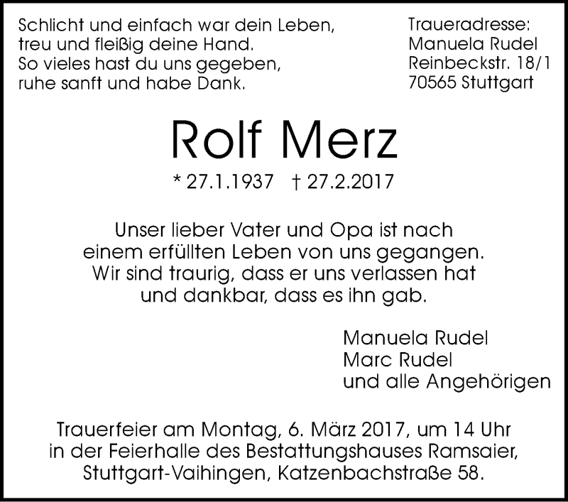Hier finden Sie alle Traueranzeigen aus der Zeitung, die bisher für Rolf Merz erschienen sind. Weitere Traueranzeigen, die in der Zeitung erscheinen, werden hier ebenfalls aufgelistet