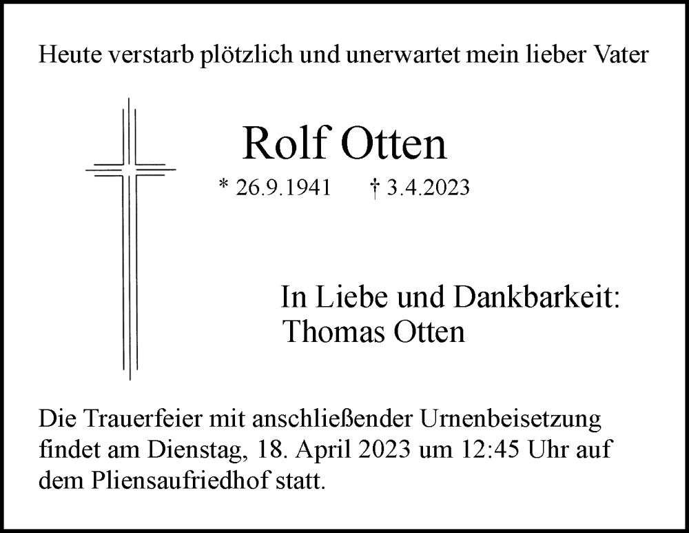 Hier finden Sie alle Traueranzeigen aus der Zeitung, die bisher für Rolf Otten erschienen sind. Weitere Traueranzeigen, die in der Zeitung erscheinen, werden hier ebenfalls aufgelistet