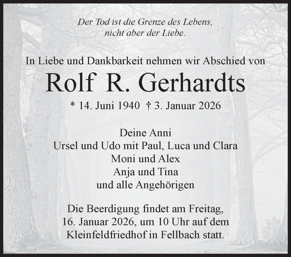Hier finden Sie alle Traueranzeigen aus der Zeitung, die bisher für Rolf R. Gerhardts erschienen sind. Weitere Traueranzeigen, die in der Zeitung erscheinen, werden hier ebenfalls aufgelistet