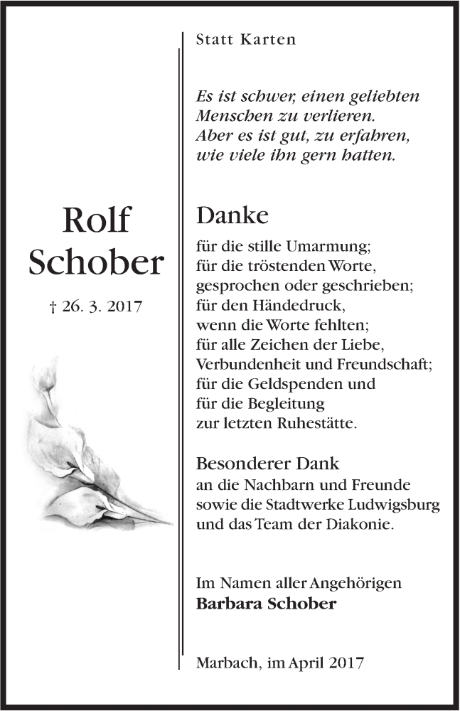 Hier finden Sie alle Traueranzeigen aus der Zeitung, die bisher für Rolf Schober erschienen sind. Weitere Traueranzeigen, die in der Zeitung erscheinen, werden hier ebenfalls aufgelistet