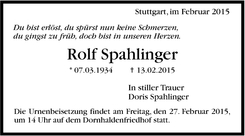 Hier finden Sie alle Traueranzeigen aus der Zeitung, die bisher für Rolf Spahlinger erschienen sind. Weitere Traueranzeigen, die in der Zeitung erscheinen, werden hier ebenfalls aufgelistet