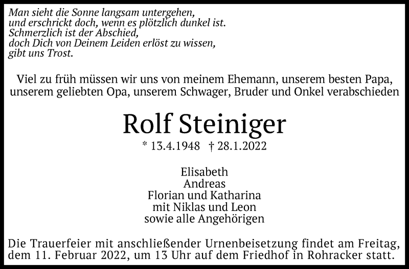 Hier finden Sie alle Traueranzeigen aus der Zeitung, die bisher für Rolf Steiniger erschienen sind. Weitere Traueranzeigen, die in der Zeitung erscheinen, werden hier ebenfalls aufgelistet