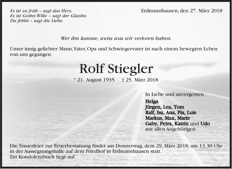 Hier finden Sie alle Traueranzeigen aus der Zeitung, die bisher für Rolf Stiegler erschienen sind. Weitere Traueranzeigen, die in der Zeitung erscheinen, werden hier ebenfalls aufgelistet