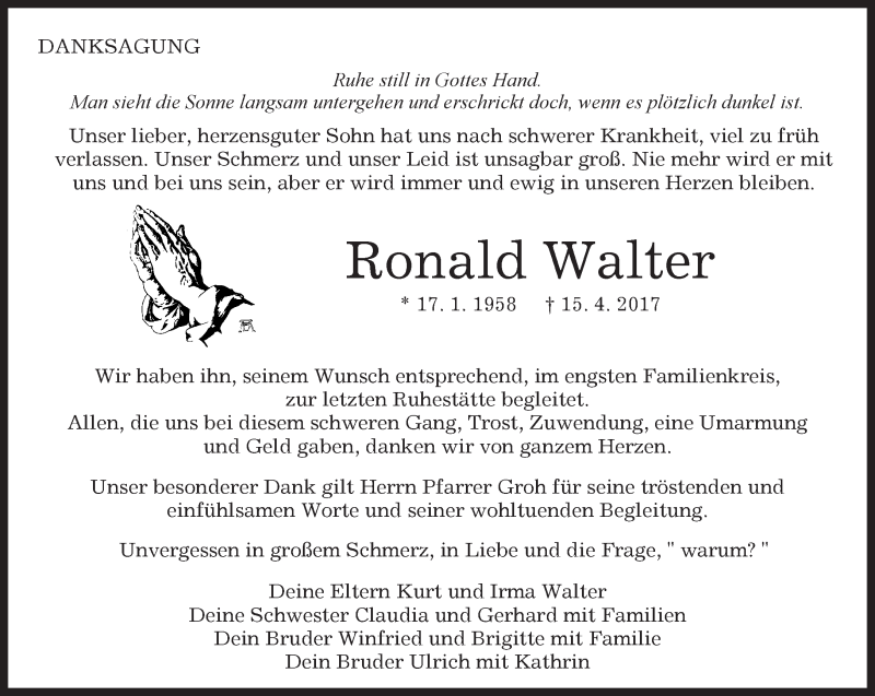 Hier finden Sie alle Traueranzeigen aus der Zeitung, die bisher für Ronald Walter erschienen sind. Weitere Traueranzeigen, die in der Zeitung erscheinen, werden hier ebenfalls aufgelistet