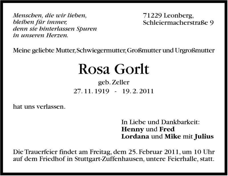 Hier finden Sie alle Traueranzeigen aus der Zeitung, die bisher für Rosa Gorlt erschienen sind. Weitere Traueranzeigen, die in der Zeitung erscheinen, werden hier ebenfalls aufgelistet