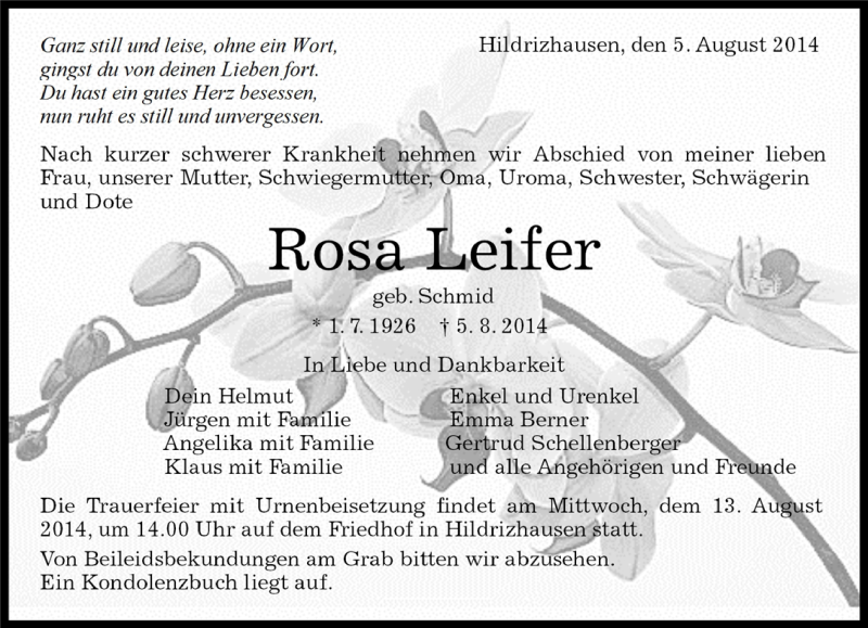 Hier finden Sie alle Traueranzeigen aus der Zeitung, die bisher für Rosa Leifer erschienen sind. Weitere Traueranzeigen, die in der Zeitung erscheinen, werden hier ebenfalls aufgelistet