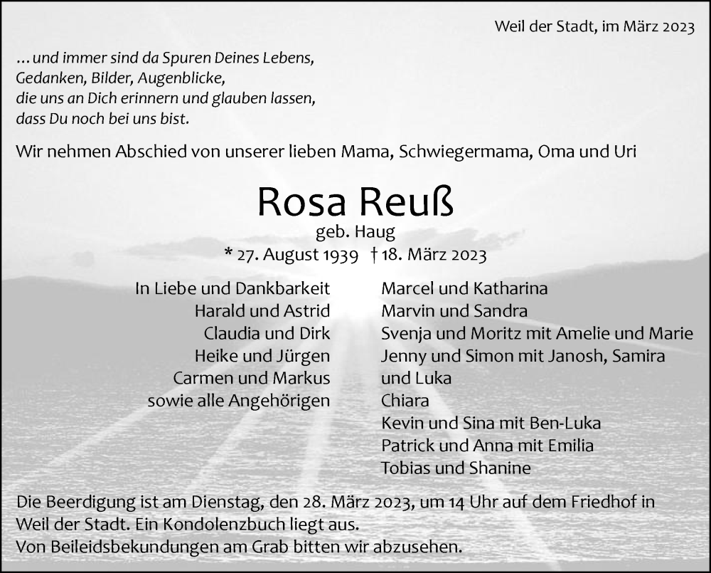 Hier finden Sie alle Traueranzeigen aus der Zeitung, die bisher für Rosa Reuß erschienen sind. Weitere Traueranzeigen, die in der Zeitung erscheinen, werden hier ebenfalls aufgelistet