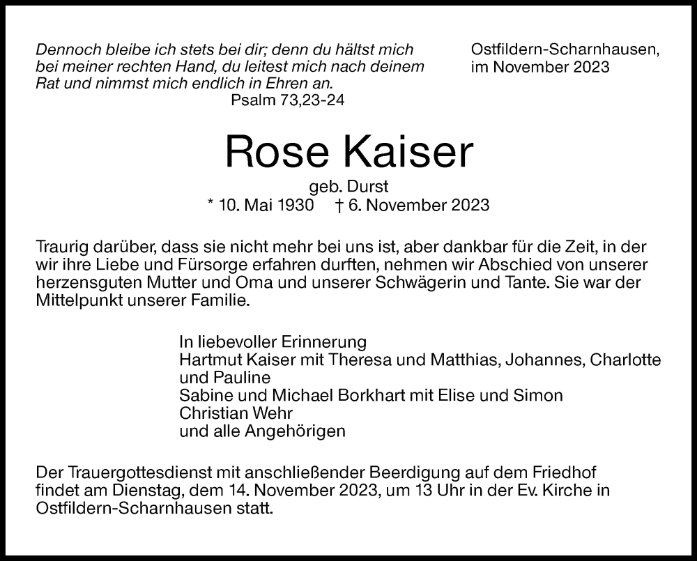 Hier finden Sie alle Traueranzeigen aus der Zeitung, die bisher für Rose Kaiser erschienen sind. Weitere Traueranzeigen, die in der Zeitung erscheinen, werden hier ebenfalls aufgelistet