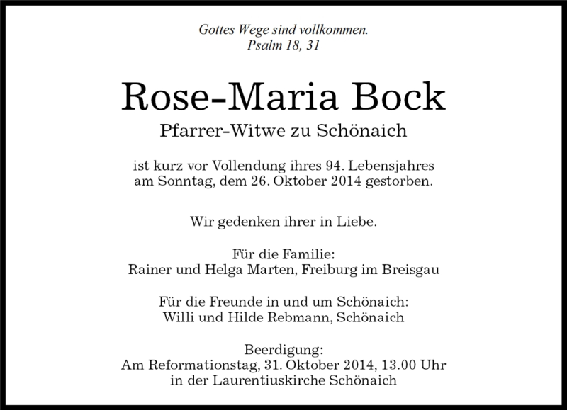 Hier finden Sie alle Traueranzeigen aus der Zeitung, die bisher für Rose-Maria Bock erschienen sind. Weitere Traueranzeigen, die in der Zeitung erscheinen, werden hier ebenfalls aufgelistet