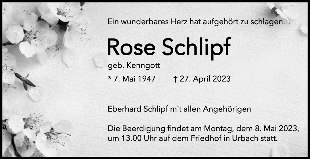 Hier finden Sie alle Traueranzeigen aus der Zeitung, die bisher für Rose Schlipf erschienen sind. Weitere Traueranzeigen, die in der Zeitung erscheinen, werden hier ebenfalls aufgelistet