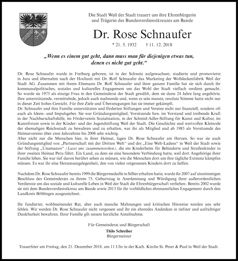 Hier finden Sie alle Traueranzeigen aus der Zeitung, die bisher für Rose Schnaufer erschienen sind. Weitere Traueranzeigen, die in der Zeitung erscheinen, werden hier ebenfalls aufgelistet
