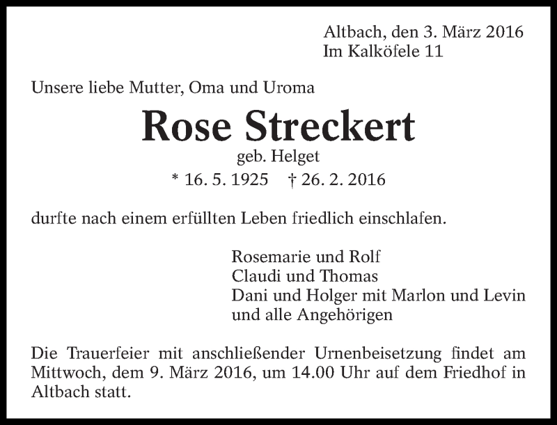 Hier finden Sie alle Traueranzeigen aus der Zeitung, die bisher für Rose Streckert erschienen sind. Weitere Traueranzeigen, die in der Zeitung erscheinen, werden hier ebenfalls aufgelistet