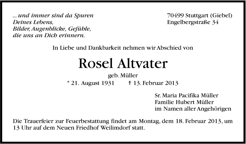 Hier finden Sie alle Traueranzeigen aus der Zeitung, die bisher für Rosel Altvater erschienen sind. Weitere Traueranzeigen, die in der Zeitung erscheinen, werden hier ebenfalls aufgelistet