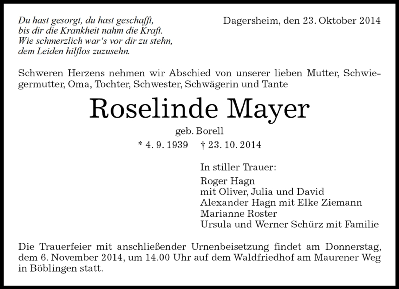 Hier finden Sie alle Traueranzeigen aus der Zeitung, die bisher für Roselinde Mayer erschienen sind. Weitere Traueranzeigen, die in der Zeitung erscheinen, werden hier ebenfalls aufgelistet