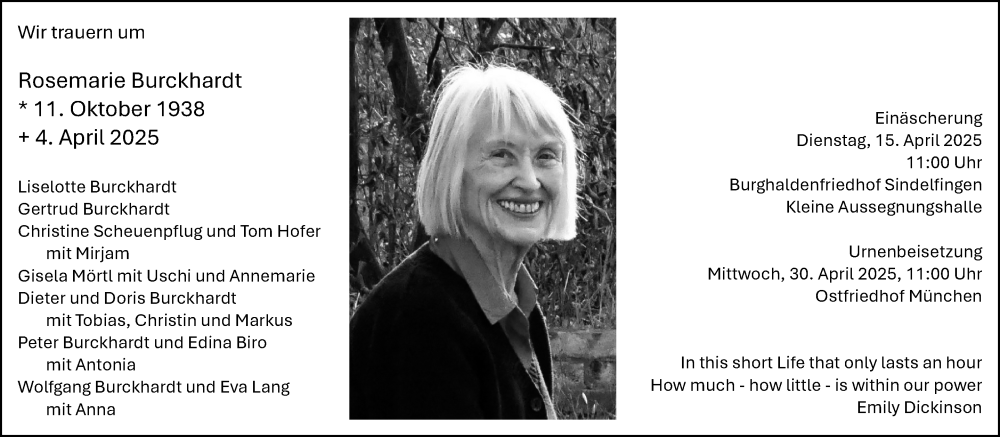 Hier finden Sie alle Traueranzeigen aus der Zeitung, die bisher für Rosemarie Burckhardt erschienen sind. Weitere Traueranzeigen, die in der Zeitung erscheinen, werden hier ebenfalls aufgelistet