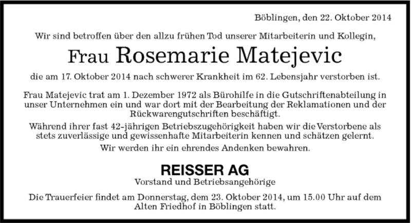 Hier finden Sie alle Traueranzeigen aus der Zeitung, die bisher für Rosemarie Matejevic erschienen sind. Weitere Traueranzeigen, die in der Zeitung erscheinen, werden hier ebenfalls aufgelistet