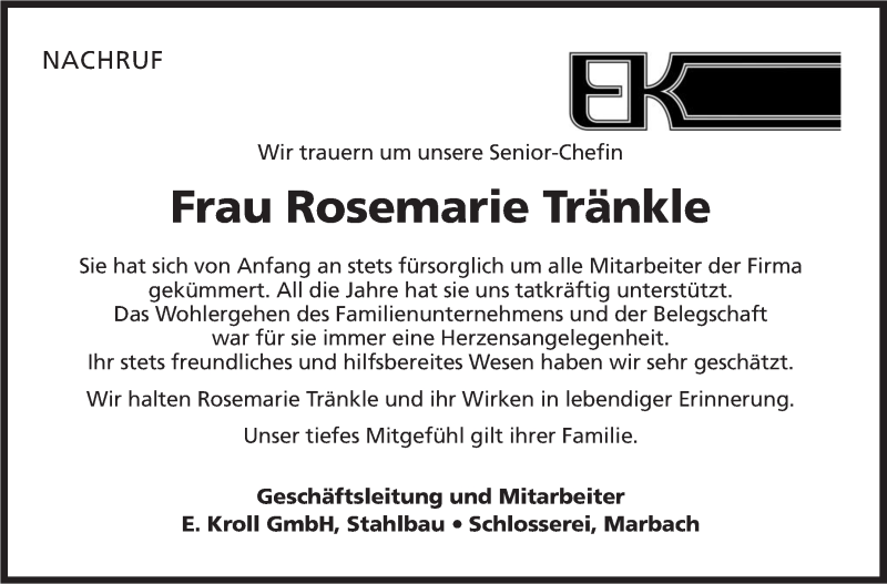 Hier finden Sie alle Traueranzeigen aus der Zeitung, die bisher für Rosemarie Tränkle erschienen sind. Weitere Traueranzeigen, die in der Zeitung erscheinen, werden hier ebenfalls aufgelistet