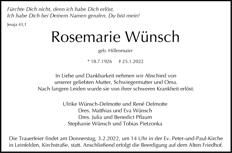 Hier finden Sie alle Traueranzeigen aus der Zeitung, die bisher für Rosemarie Wünsch erschienen sind. Weitere Traueranzeigen, die in der Zeitung erscheinen, werden hier ebenfalls aufgelistet