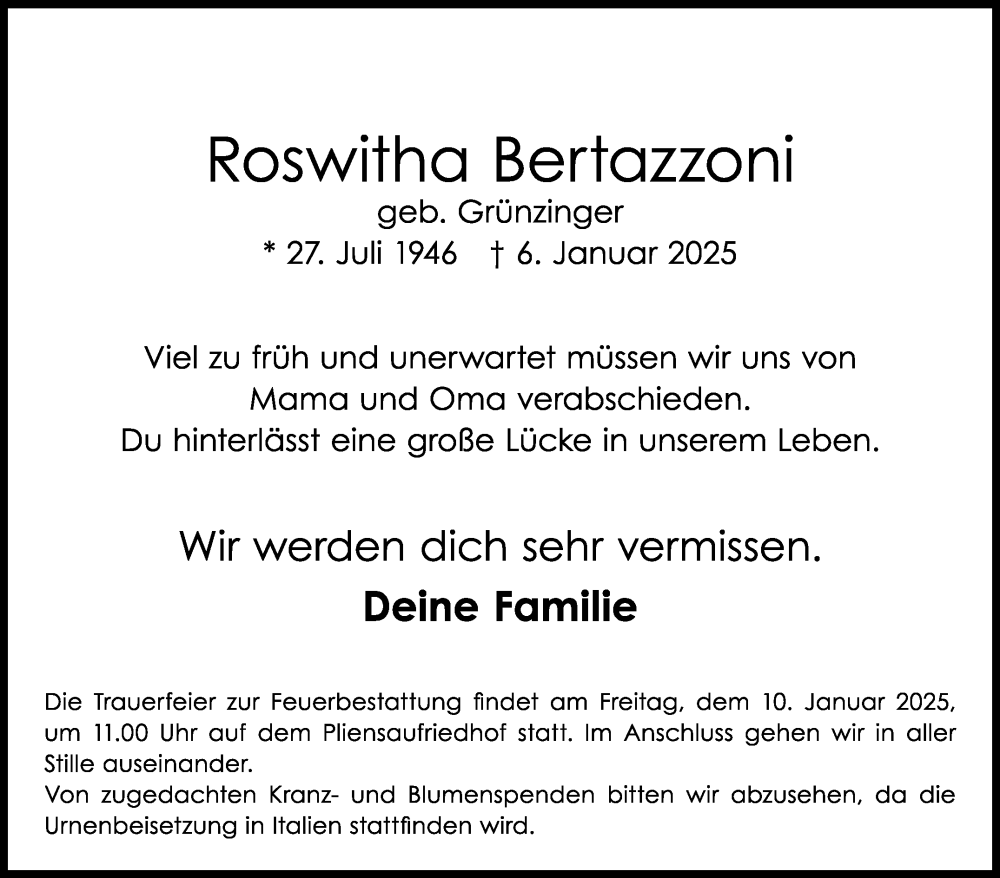 Hier finden Sie alle Traueranzeigen aus der Zeitung, die bisher für Roswitha Bertazzoni erschienen sind. Weitere Traueranzeigen, die in der Zeitung erscheinen, werden hier ebenfalls aufgelistet