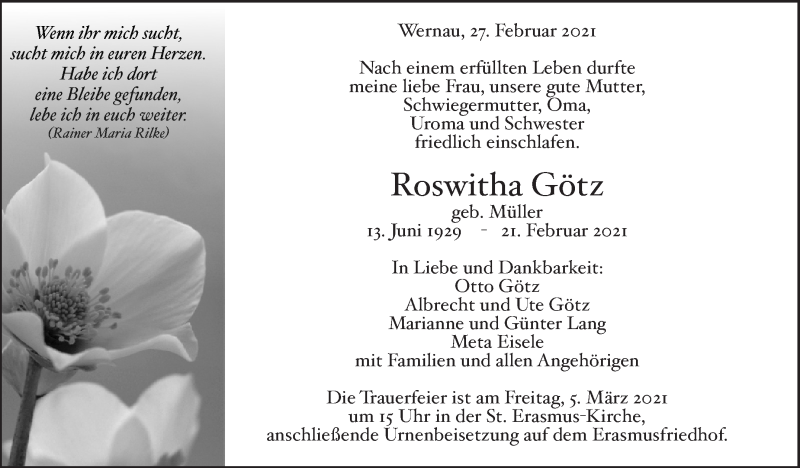 Hier finden Sie alle Traueranzeigen aus der Zeitung, die bisher für Roswitha Götz erschienen sind. Weitere Traueranzeigen, die in der Zeitung erscheinen, werden hier ebenfalls aufgelistet