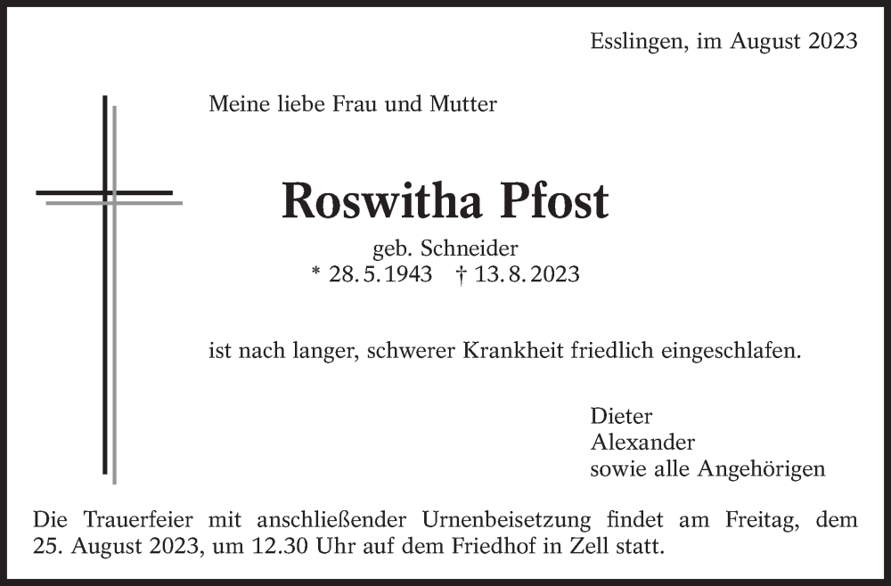 Hier finden Sie alle Traueranzeigen aus der Zeitung, die bisher für Roswitha Pfost erschienen sind. Weitere Traueranzeigen, die in der Zeitung erscheinen, werden hier ebenfalls aufgelistet