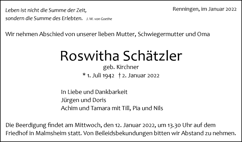 Hier finden Sie alle Traueranzeigen aus der Zeitung, die bisher für Roswitha Schätzler erschienen sind. Weitere Traueranzeigen, die in der Zeitung erscheinen, werden hier ebenfalls aufgelistet