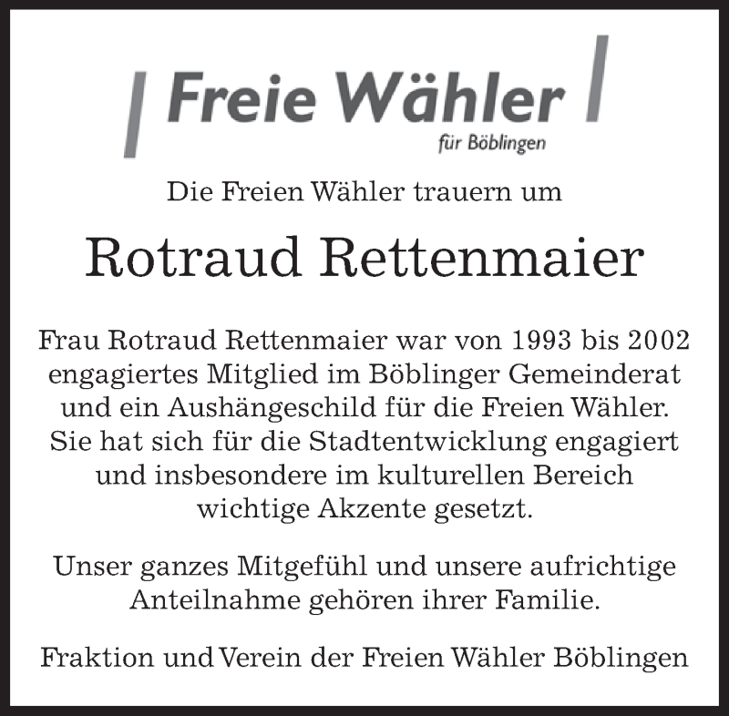Hier finden Sie alle Traueranzeigen aus der Zeitung, die bisher für Rotraud Rettenmaier erschienen sind. Weitere Traueranzeigen, die in der Zeitung erscheinen, werden hier ebenfalls aufgelistet