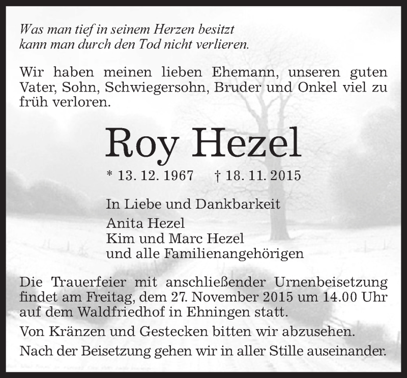Hier finden Sie alle Traueranzeigen aus der Zeitung, die bisher für Roy Hezel erschienen sind. Weitere Traueranzeigen, die in der Zeitung erscheinen, werden hier ebenfalls aufgelistet