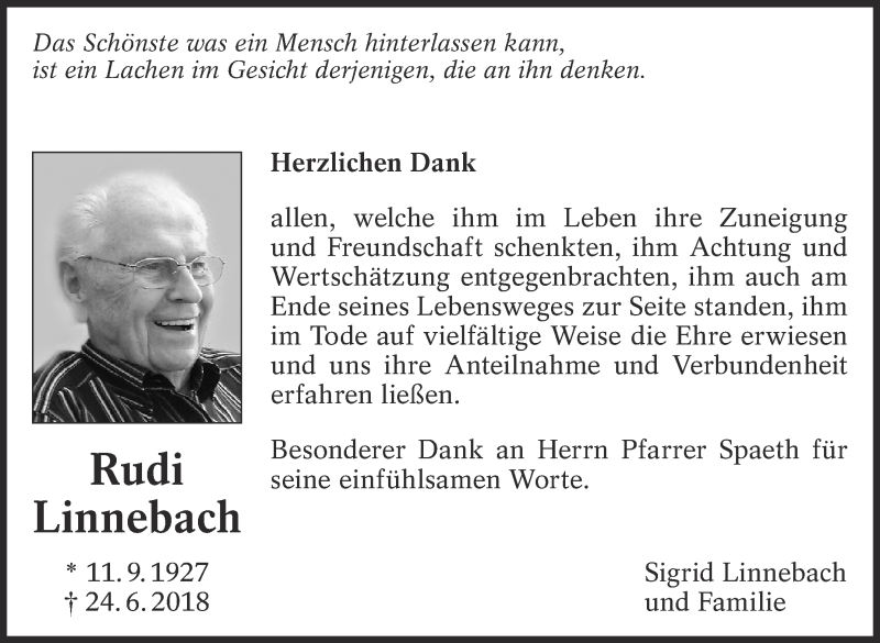 Hier finden Sie alle Traueranzeigen aus der Zeitung, die bisher für Rudi Linnebach erschienen sind. Weitere Traueranzeigen, die in der Zeitung erscheinen, werden hier ebenfalls aufgelistet