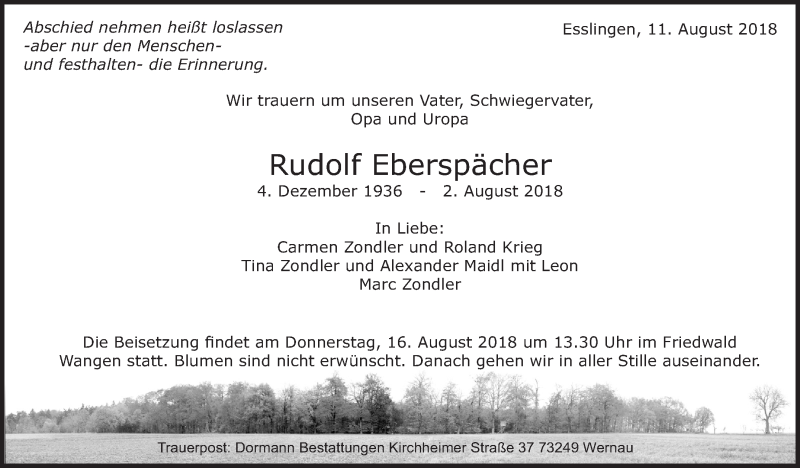 Hier finden Sie alle Traueranzeigen aus der Zeitung, die bisher für Rudolf Eberspächer erschienen sind. Weitere Traueranzeigen, die in der Zeitung erscheinen, werden hier ebenfalls aufgelistet