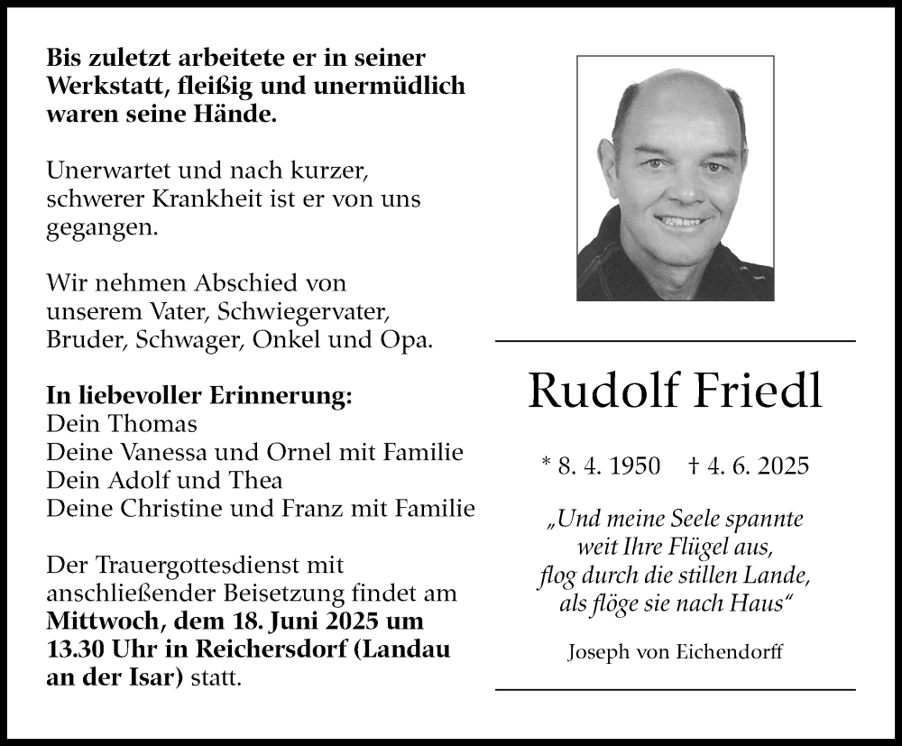 Hier finden Sie alle Traueranzeigen aus der Zeitung, die bisher für Rudolf Friedl erschienen sind. Weitere Traueranzeigen, die in der Zeitung erscheinen, werden hier ebenfalls aufgelistet