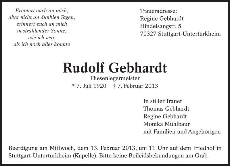 Hier finden Sie alle Traueranzeigen aus der Zeitung, die bisher für Rudolf Gebhardt erschienen sind. Weitere Traueranzeigen, die in der Zeitung erscheinen, werden hier ebenfalls aufgelistet