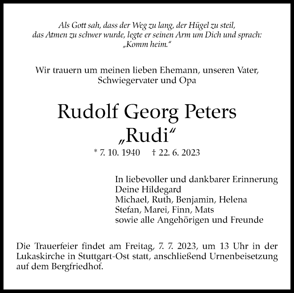Hier finden Sie alle Traueranzeigen aus der Zeitung, die bisher für Rudolf Georg Peters erschienen sind. Weitere Traueranzeigen, die in der Zeitung erscheinen, werden hier ebenfalls aufgelistet