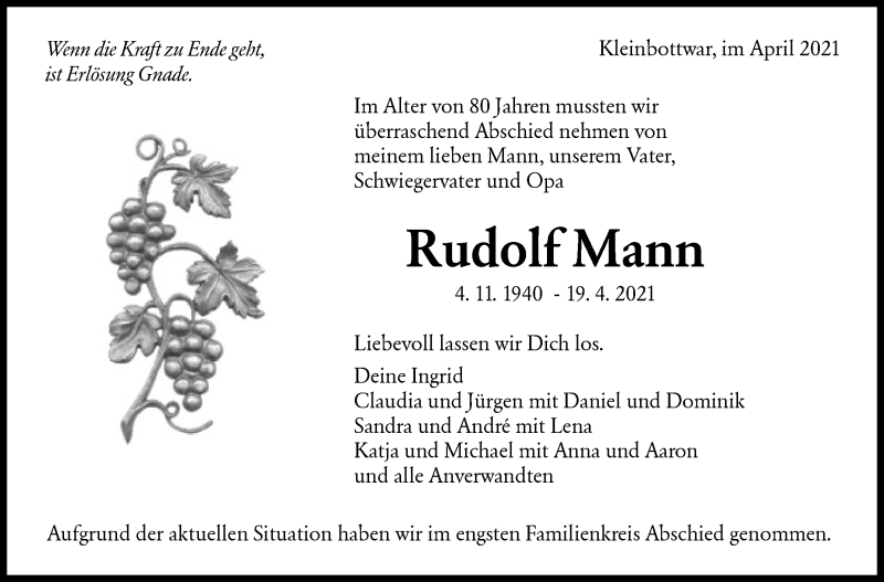 Hier finden Sie alle Traueranzeigen aus der Zeitung, die bisher für Rudolf Mann erschienen sind. Weitere Traueranzeigen, die in der Zeitung erscheinen, werden hier ebenfalls aufgelistet