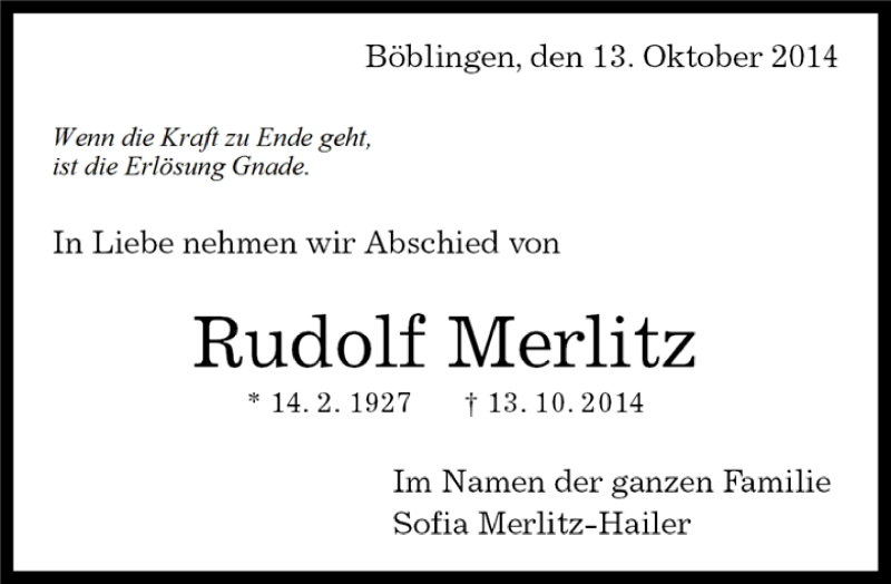 Hier finden Sie alle Traueranzeigen aus der Zeitung, die bisher für Rudolf Merlitz erschienen sind. Weitere Traueranzeigen, die in der Zeitung erscheinen, werden hier ebenfalls aufgelistet