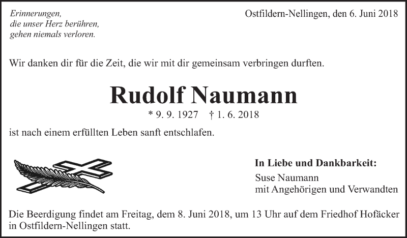 Hier finden Sie alle Traueranzeigen aus der Zeitung, die bisher für Rudolf Naumann erschienen sind. Weitere Traueranzeigen, die in der Zeitung erscheinen, werden hier ebenfalls aufgelistet