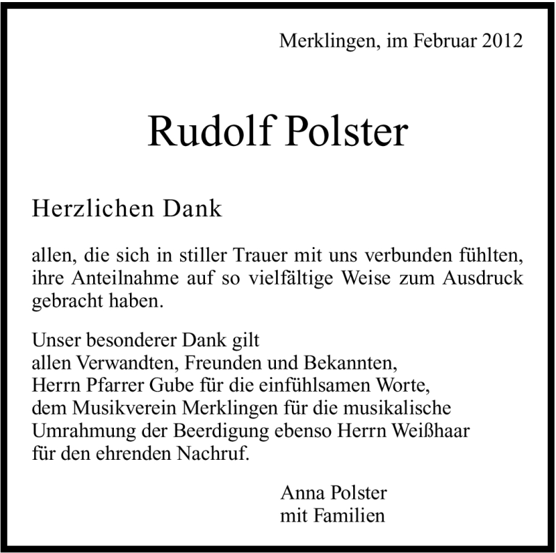 Hier finden Sie alle Traueranzeigen aus der Zeitung, die bisher für Rudolf Polster erschienen sind. Weitere Traueranzeigen, die in der Zeitung erscheinen, werden hier ebenfalls aufgelistet