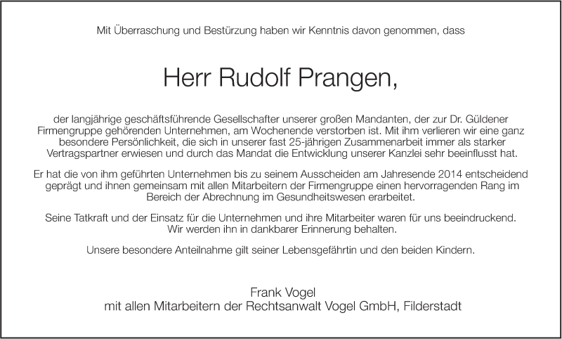 Hier finden Sie alle Traueranzeigen aus der Zeitung, die bisher für Rudolf Prangen erschienen sind. Weitere Traueranzeigen, die in der Zeitung erscheinen, werden hier ebenfalls aufgelistet