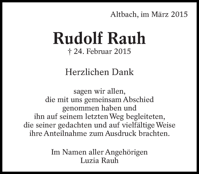 Hier finden Sie alle Traueranzeigen aus der Zeitung, die bisher für Rudolf Rauh erschienen sind. Weitere Traueranzeigen, die in der Zeitung erscheinen, werden hier ebenfalls aufgelistet