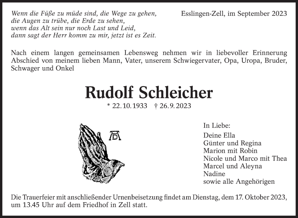 Hier finden Sie alle Traueranzeigen aus der Zeitung, die bisher für Rudolf Schleicher erschienen sind. Weitere Traueranzeigen, die in der Zeitung erscheinen, werden hier ebenfalls aufgelistet
