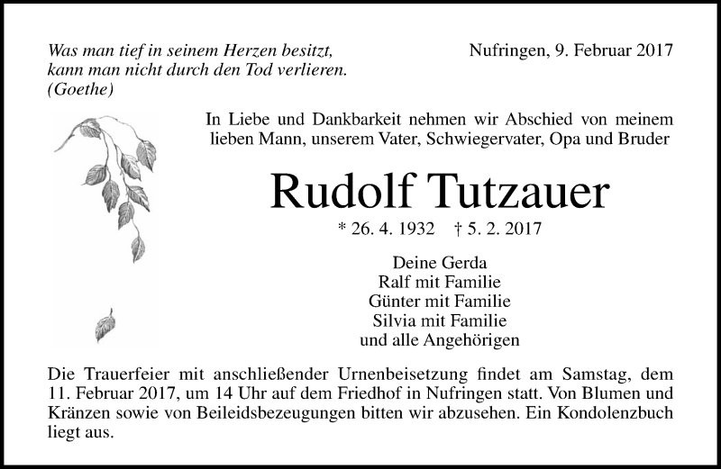 Hier finden Sie alle Traueranzeigen aus der Zeitung, die bisher für Rudolf Tutzauer erschienen sind. Weitere Traueranzeigen, die in der Zeitung erscheinen, werden hier ebenfalls aufgelistet