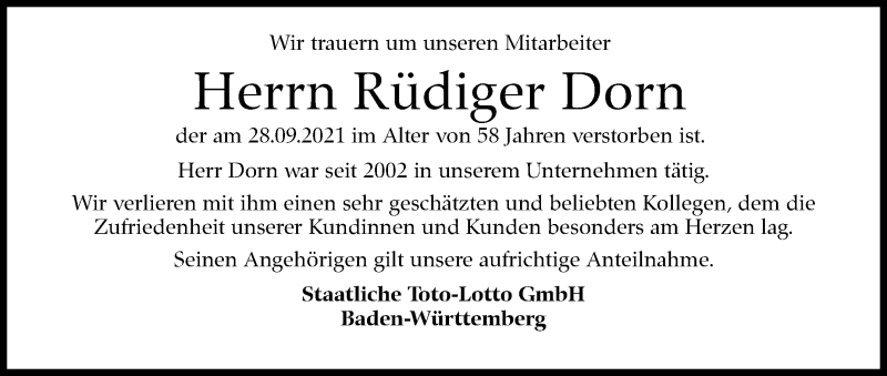 Hier finden Sie alle Traueranzeigen aus der Zeitung, die bisher für Rüdiger Dorn erschienen sind. Weitere Traueranzeigen, die in der Zeitung erscheinen, werden hier ebenfalls aufgelistet