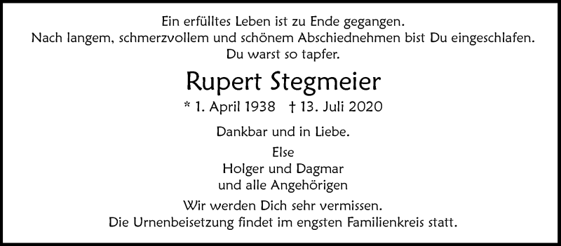 Hier finden Sie alle Traueranzeigen aus der Zeitung, die bisher für Rupert Stegmeier erschienen sind. Weitere Traueranzeigen, die in der Zeitung erscheinen, werden hier ebenfalls aufgelistet