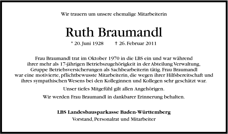 Hier finden Sie alle Traueranzeigen aus der Zeitung, die bisher für Ruth Braumandl erschienen sind. Weitere Traueranzeigen, die in der Zeitung erscheinen, werden hier ebenfalls aufgelistet