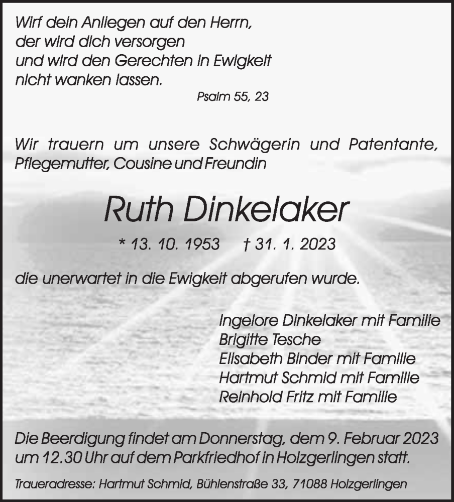 Hier finden Sie alle Traueranzeigen aus der Zeitung, die bisher für Ruth Dinkelaker erschienen sind. Weitere Traueranzeigen, die in der Zeitung erscheinen, werden hier ebenfalls aufgelistet