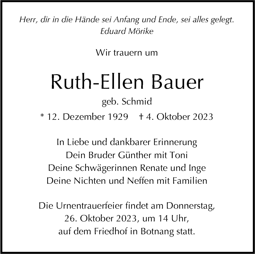 Hier finden Sie alle Traueranzeigen aus der Zeitung, die bisher für Ruth-Ellen Bauer erschienen sind. Weitere Traueranzeigen, die in der Zeitung erscheinen, werden hier ebenfalls aufgelistet