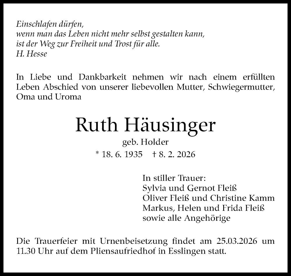 Hier finden Sie alle Traueranzeigen aus der Zeitung, die bisher für Ruth Häusinger erschienen sind. Weitere Traueranzeigen, die in der Zeitung erscheinen, werden hier ebenfalls aufgelistet