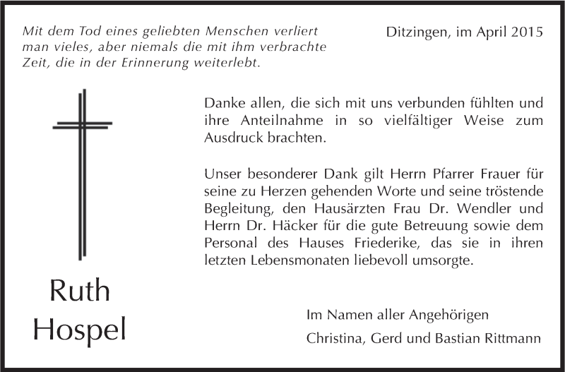 Hier finden Sie alle Traueranzeigen aus der Zeitung, die bisher für Ruth Hospel erschienen sind. Weitere Traueranzeigen, die in der Zeitung erscheinen, werden hier ebenfalls aufgelistet